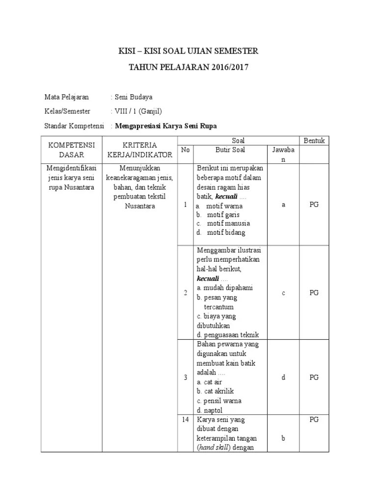 Kisi Kisi Soal Ujian Seni Budaya Semester Ganjil 2016-2017 - Kisi Kisi Soal Pas Uas Seni Budaya Kelas 7 Smp Mts Semester 1 Kurikulum 2013 Tahun 2021 2022 Pojok Sekolah / Kompetensi dasar indikator soal 1 2 ppkn 1 mengenal keragaman karakteristik.. Kompetensi dasar indikator soal 1 2 ppkn 1 mengenal keragaman karakteristik.